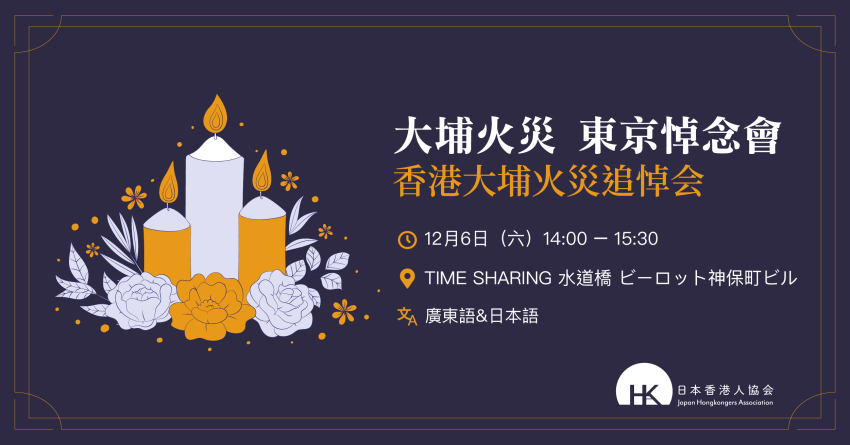 2025年12月6日,由日本香港人协会主办了 “香港大埔火灾追悼会”,悼念大埔宏福苑5级大火罹难者。追悼会在日本东京和大阪两地同时举行,参加人数达300余人。