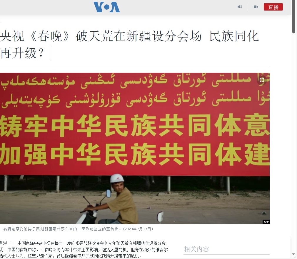 关于,2024年1月4日中国中央电视台宣布选定新疆喀什成为今年《春晚》四个分会场,美国知音发表了题为「央视《春晚》破天荒在新疆设分会场 民族同化再升级?」的文章。