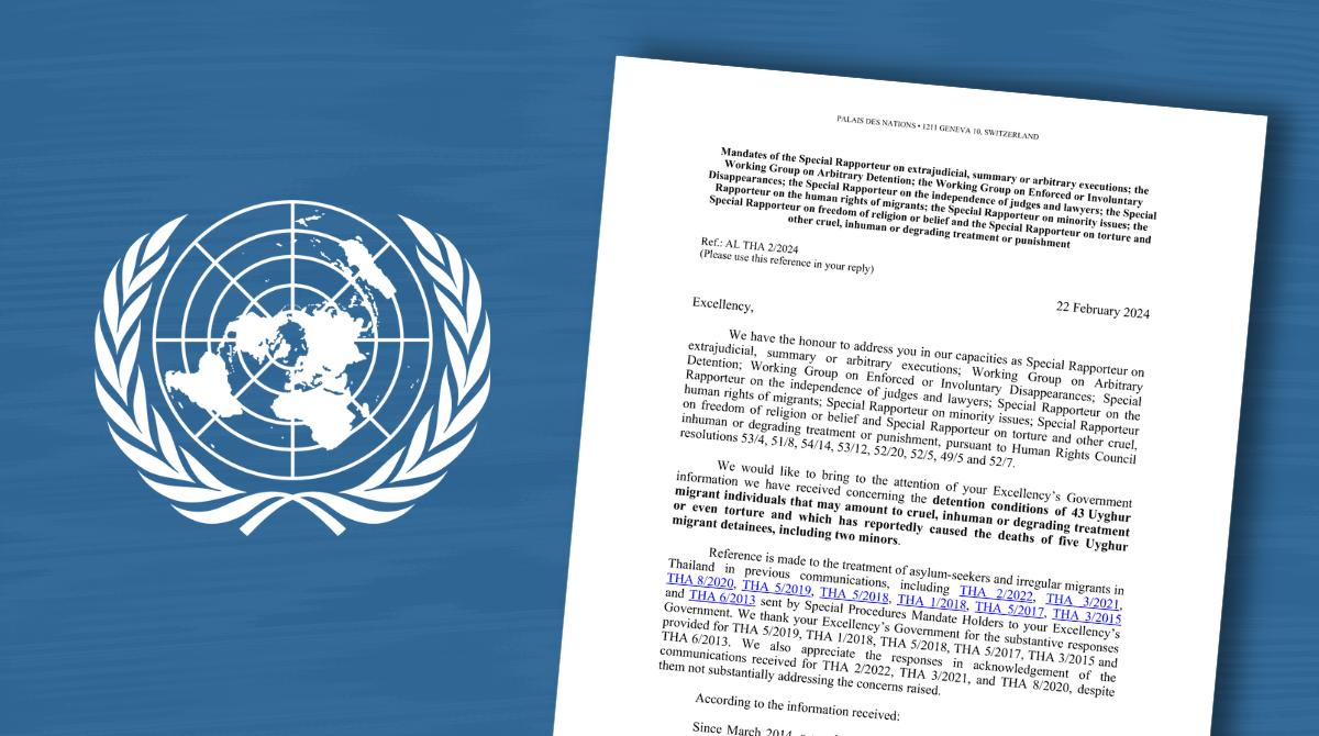 2024年2月22日、联合国五位特别报告员和两个工作组致信泰王国政府,表示关切至少43名维吾尔难民被任意拘留于泰国移民设施,并呼吁泰国政府提供有关维吾尔人长达十年的任意拘留、医疗服务以及拘留条件的信息。此外,这封信还要求泰国当局提供有关他们长期隔离监禁的信息,并问及是否正在采取措施以解决他们与家人和法律代表沟通和探视的权利。联合国专家还"严重关注",2015年“没有根据国际人权和难民法评估他们的保护需求”就强行遣返了109名维吾尔人。他们还敦促泰国政府保障移民的人权,确保充分遵守不驱回原则。